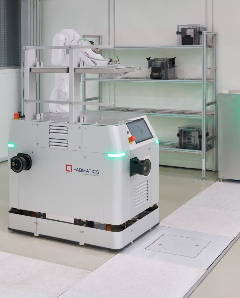 Dieser mobile Roboter, entwickelt von Fabmatics, erledigt Transportaufträge zwischen Prozessanlagen sowie Handhabungsaufgaben zur Be- und Entladung von Prozessanlagen ohne manuelles Eingreifen.